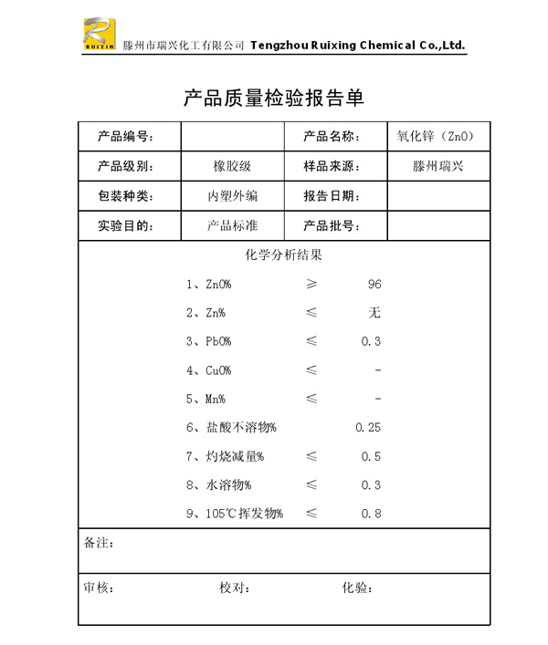 瑞興化工有限公司是生產氧化鋅的重點企業,于2008年通過ISO9001:2008質量管理體系認證。“瑞興”牌氧化鋅在國內擁有較大穩定的市場,并遠銷東南亞、中東、中南美等國家和地區,在國內外享有較高聲譽。